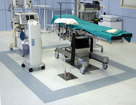 Линолеум укладывается на предварительно загрунтованное токопроводящей грунтовкой систему заземления (медную ленту), при помощи токопроводящего клея для линолеума. Между собой укладывается методом горячей сварки.
