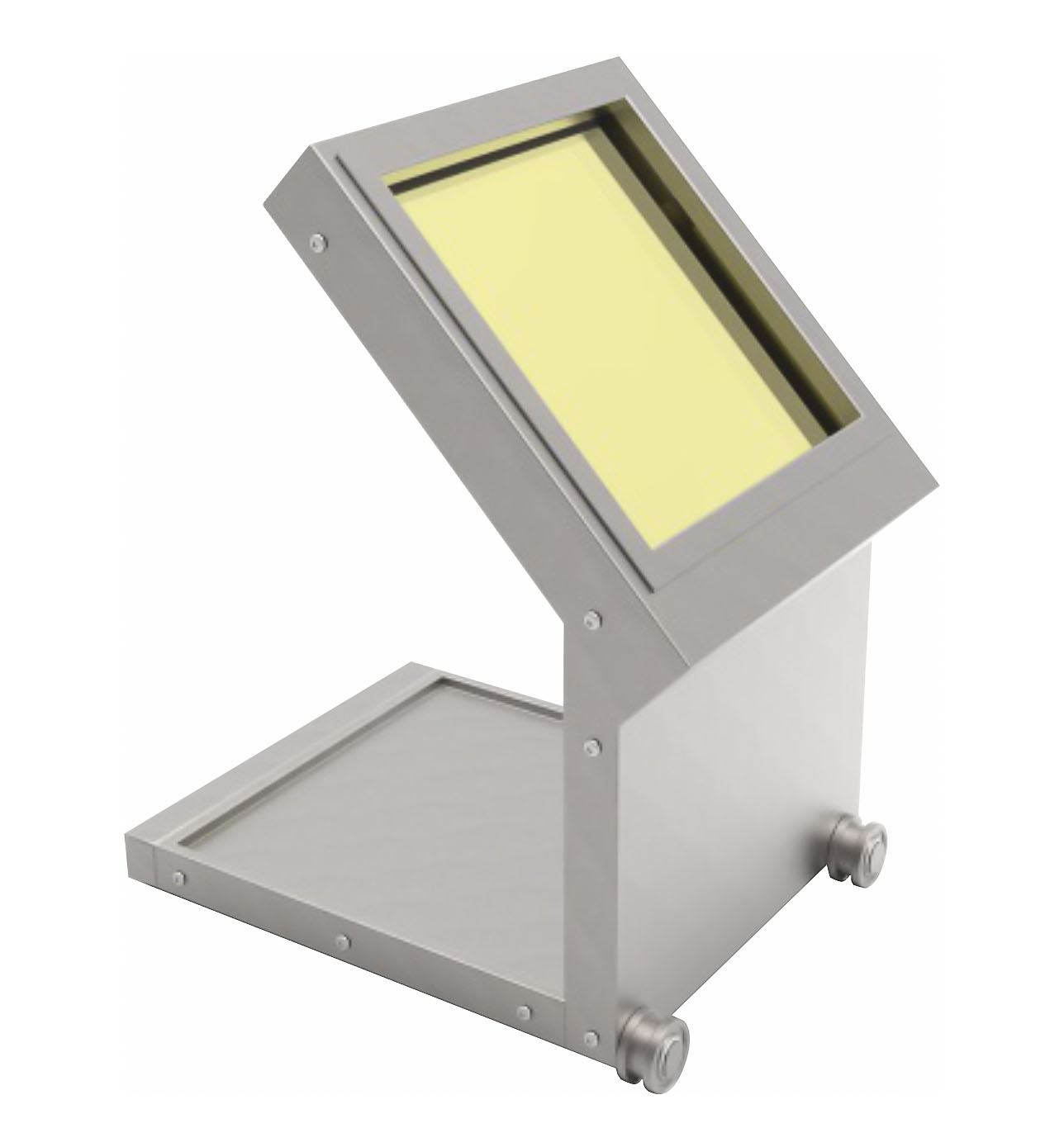 Экран защитный выполнен из нержавеющей стали. Наклонная защитная панель оснащена просвинцованным стеклом. Для удобства перемещения экрана в горизонтальной плоскости, основание имеет четыре направляющих ролика.